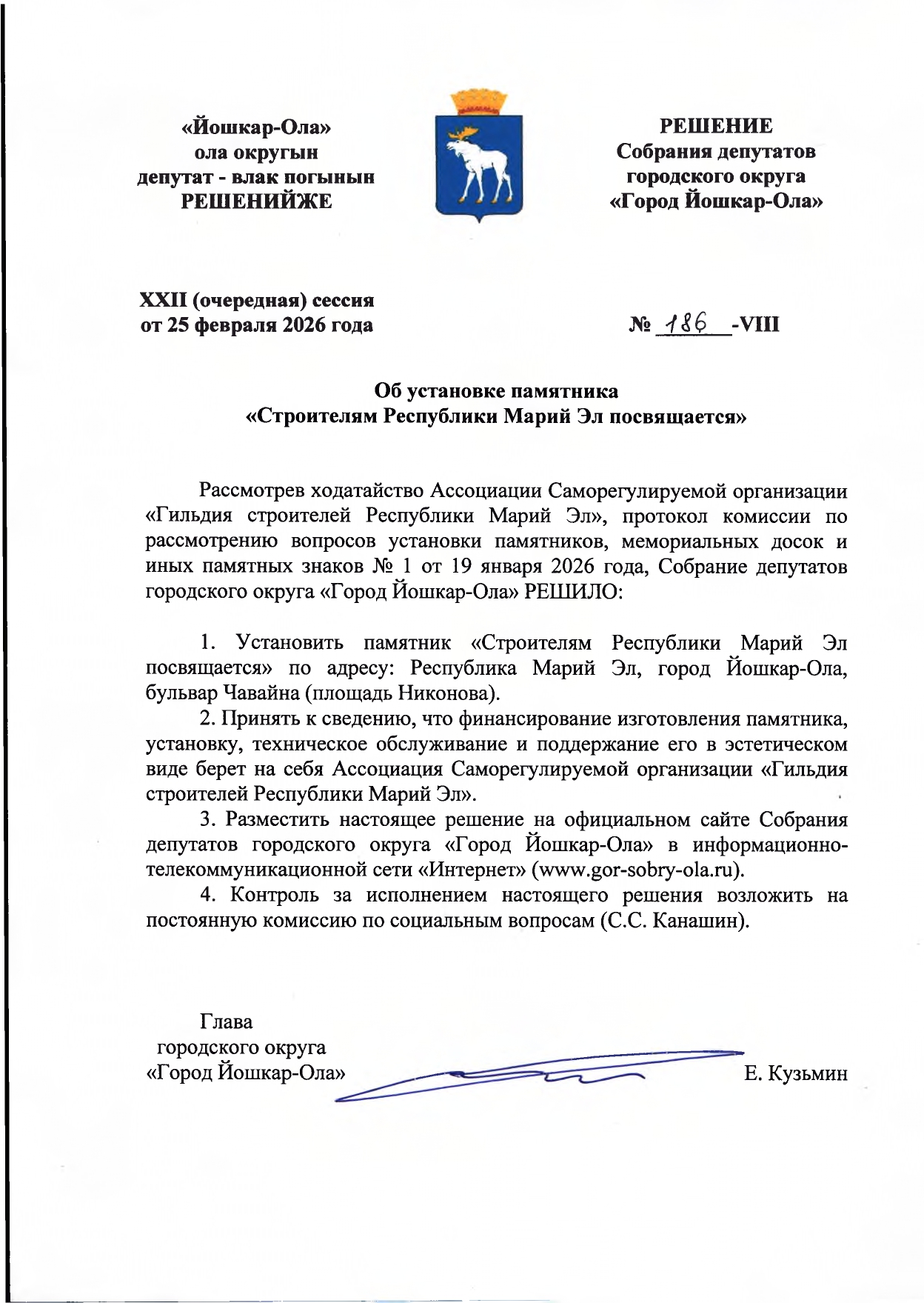 25 февраля 2026 года Собранием депутатов городского округа «Город Йошкар-Ола» принято решение об установке памятника «Строителям Республики Марий Эл» посвящается» по адресу: город Йошкар-Ола, бульвар Чавайна (площадь Никонова).